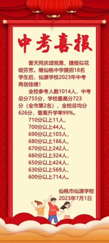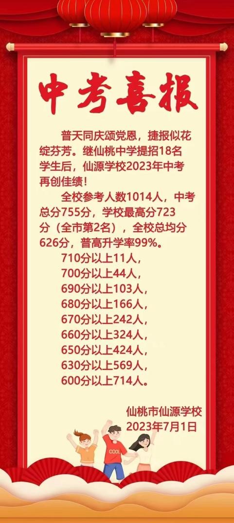 恭喜仙源學(xué)校在2023年中考中取得優(yōu)異的成績!全校參考人數(shù)1014人,中考總分755分,學(xué)校最高分723分(全市第2名),全校總均分626分,普高升學(xué)率99%!